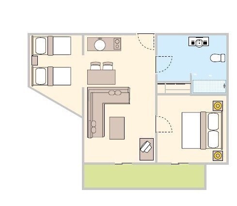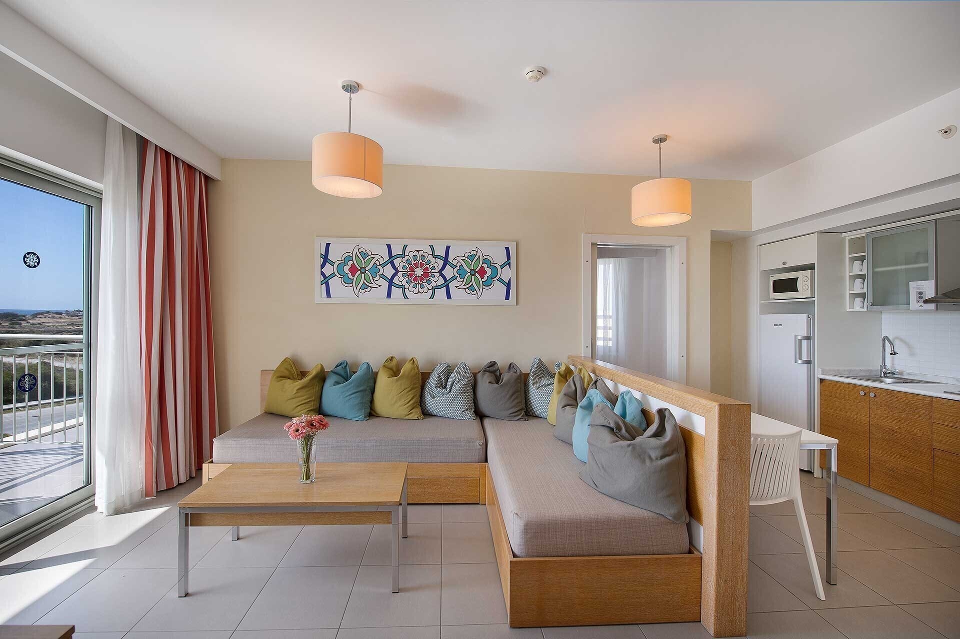 - ComentariiLiving cu o chicinetă (în bucătărie - cuptor cu microunde, frigider, ceainic electric, prăjitor de pâine, aragaz). Livingul are 2 canapele.